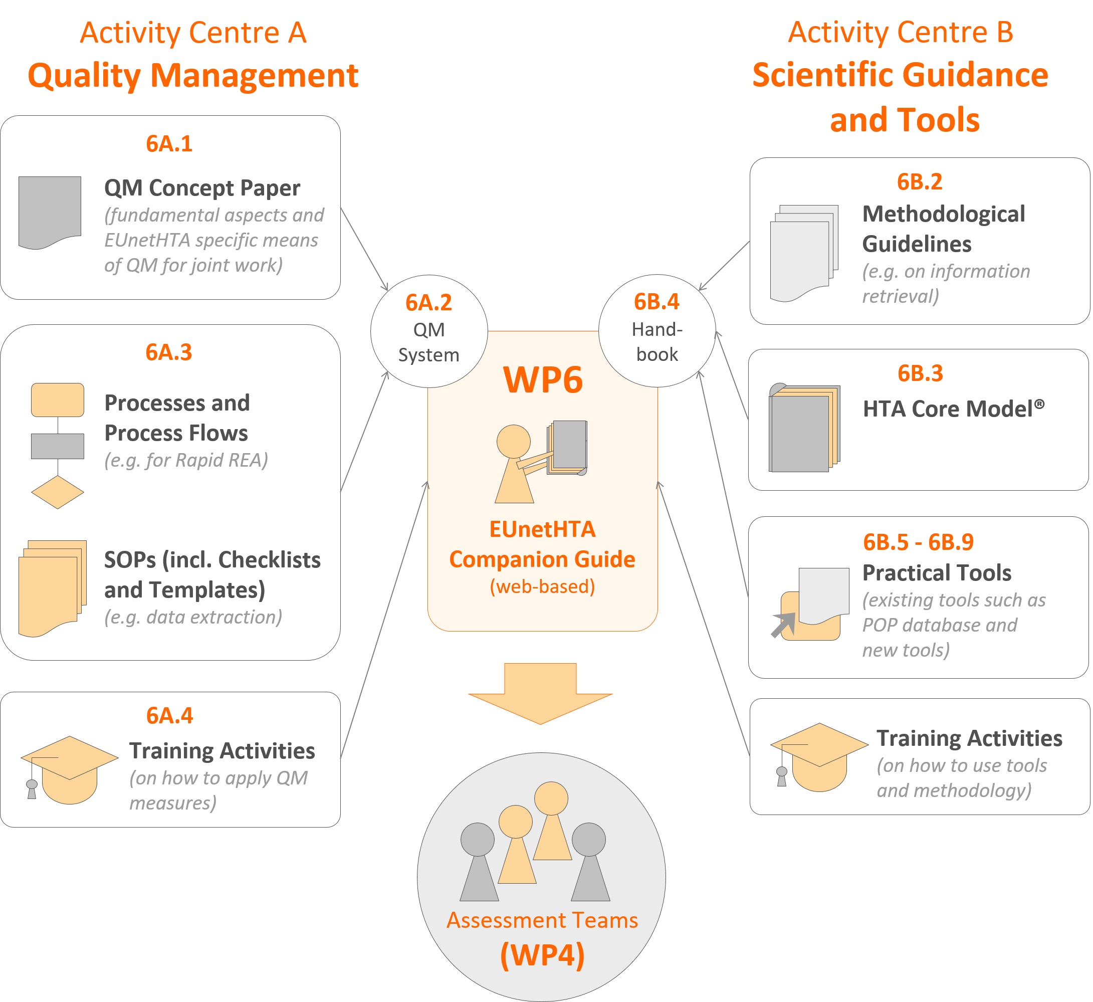 The EUnetHTA Companion Guide comprises all output of WP6 “Quality Management, Scientific Guidance and Tools” (see illustration below). The procedure manuals of JA2 are replaced by the Process Flows and Standard Operating Procedures (SOPs) provided on this website. The EUnetHTA Companion Guide is applicable to all joint and collaborative assessments of WP4.
